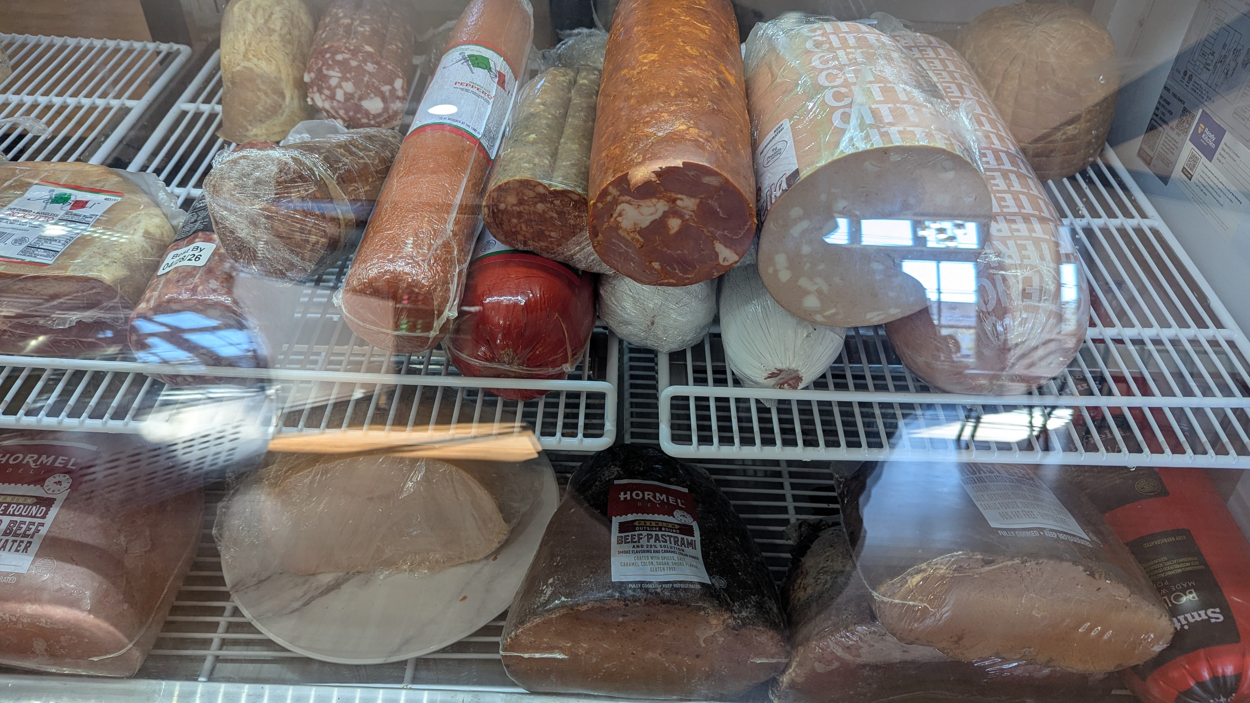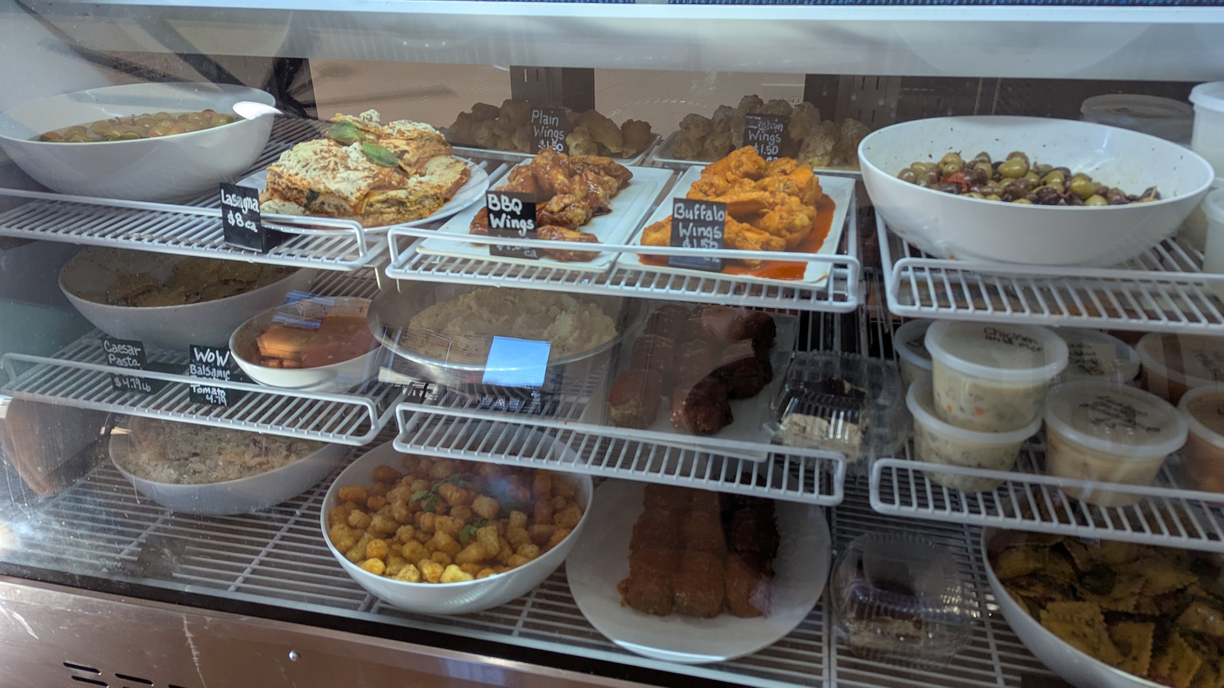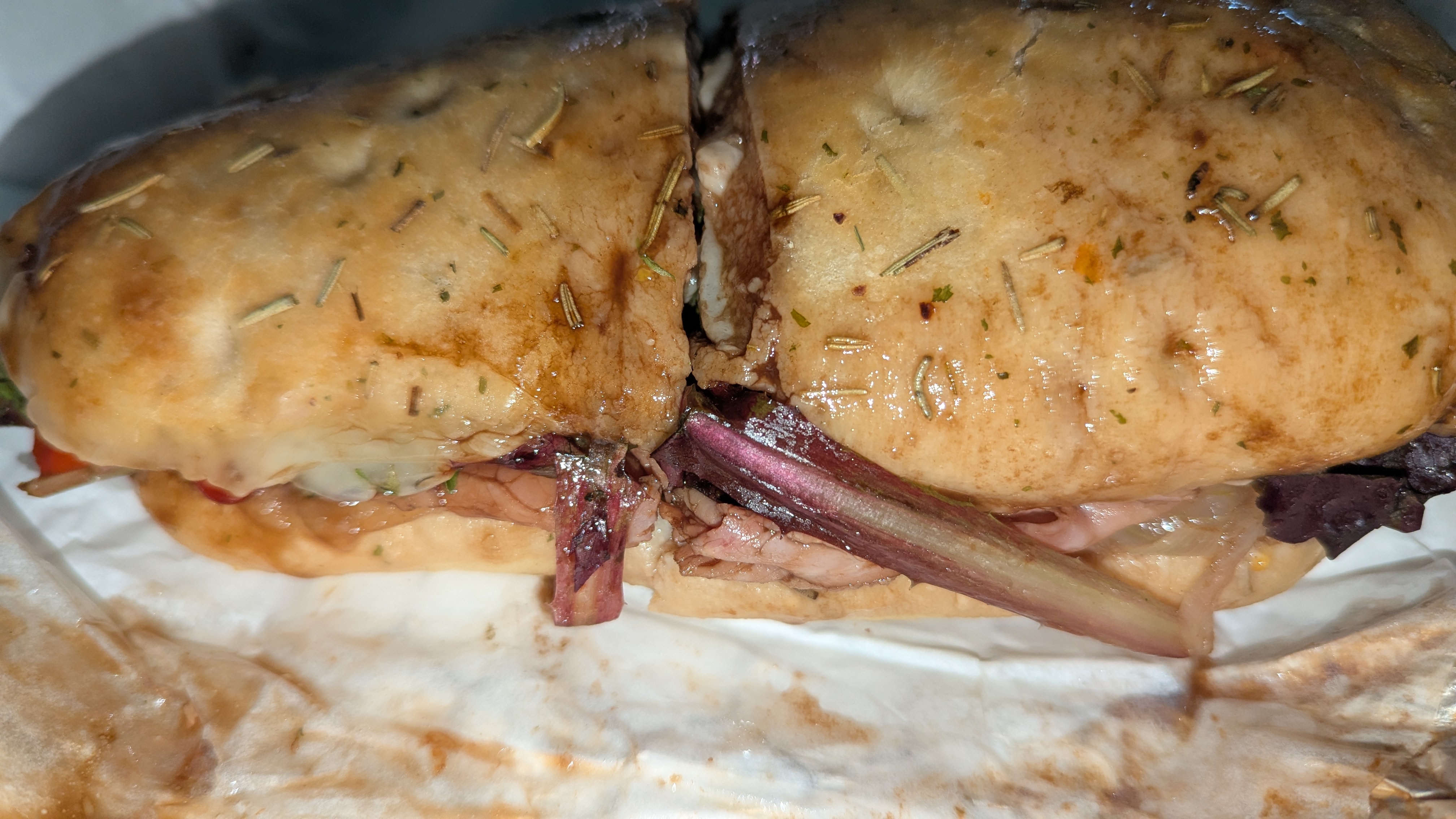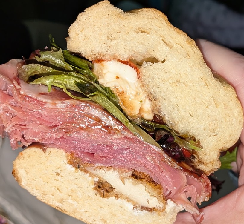 It was quiet when we got there and greeted enthusiastically by the owner along with several employees. The menu board on the wall was quite simple, so we picked out respective sandwiches. I ordered the toasted College & 36th, a sandwich stuffed with baked ham, Cooper white cheese, caramelized onion jam, Romaine, roasted tomato, all on a rosemary loaf. Big K got the cold sandwich called the Abruzzi. This sandwich is huge, with crispy chicken, Prosciutto, Ricotta cheese, mozzarella, arugula, roasted bell peppers with a balsamic glaze on a roll. While the owner was making up the sandwiches, we checked out the other offerings. They had plenty of sides, but we decided on the pasta salad and potato salad. We got everything to go, so we could just relax and eat at home. We dove into the sides first, the pasta salad was amazing. Large cheese filled ravioli with spices and parmesan cheese in what seemed to be an olive oil. Then we had the potato salad, which was also good. Large chunks of skin-on red potatoes in a creamy mayo-type sauce. Then we got to our sandwiches. The Abruzzi that Big K ordered was stuffed full of meats. I had a small bite, this will be what I get on my next visit. The chicken with the Prosciutto worked so well with the Ricotta and mozzarella providing some color to the flavors. My College and 36th was great as well. The ham and cheese worked so well with the caramelized onion, so good together.