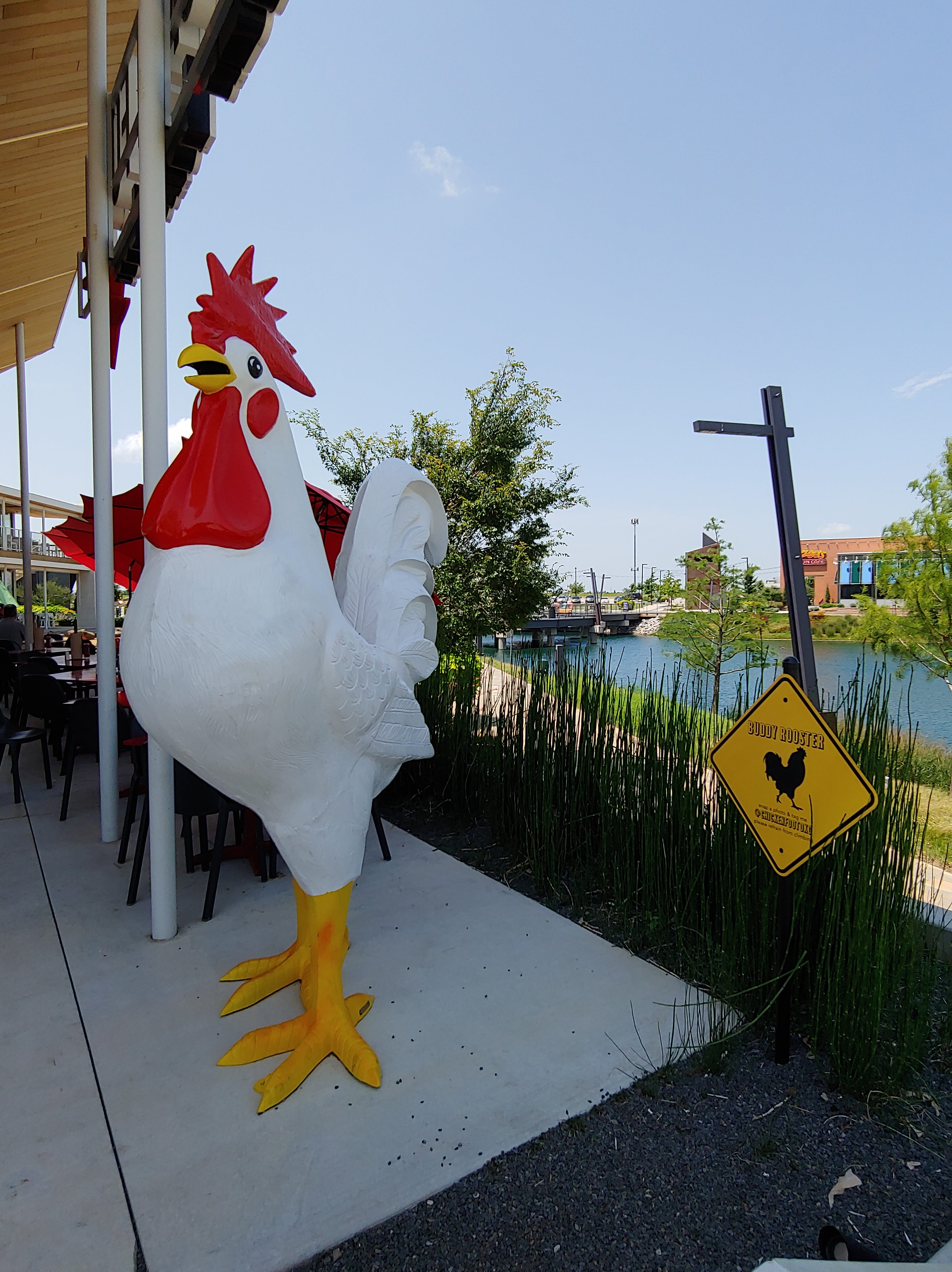 Located in the new Chisholm Creek entertainment district in NW Oklahoma City at Western and Memorial, just southwest of the Kilpatrick turnpike. It sits up against Memorial Road, right east of the pond. There is a giant fiberglass chicken that sits between the building and the pond. There is indoor and outdoor seating, so good for anytime of the day. I give them 5 strips of bacon.