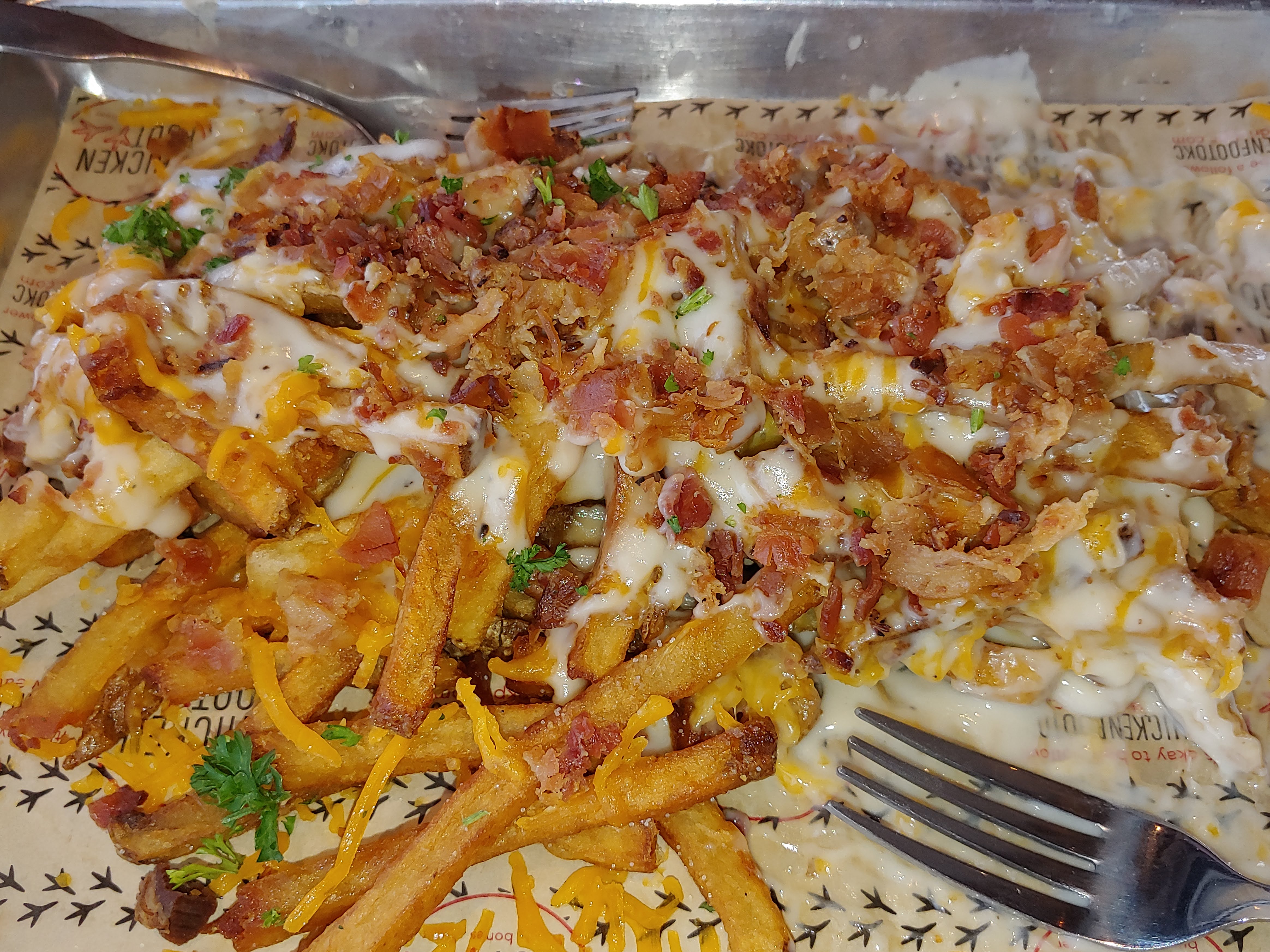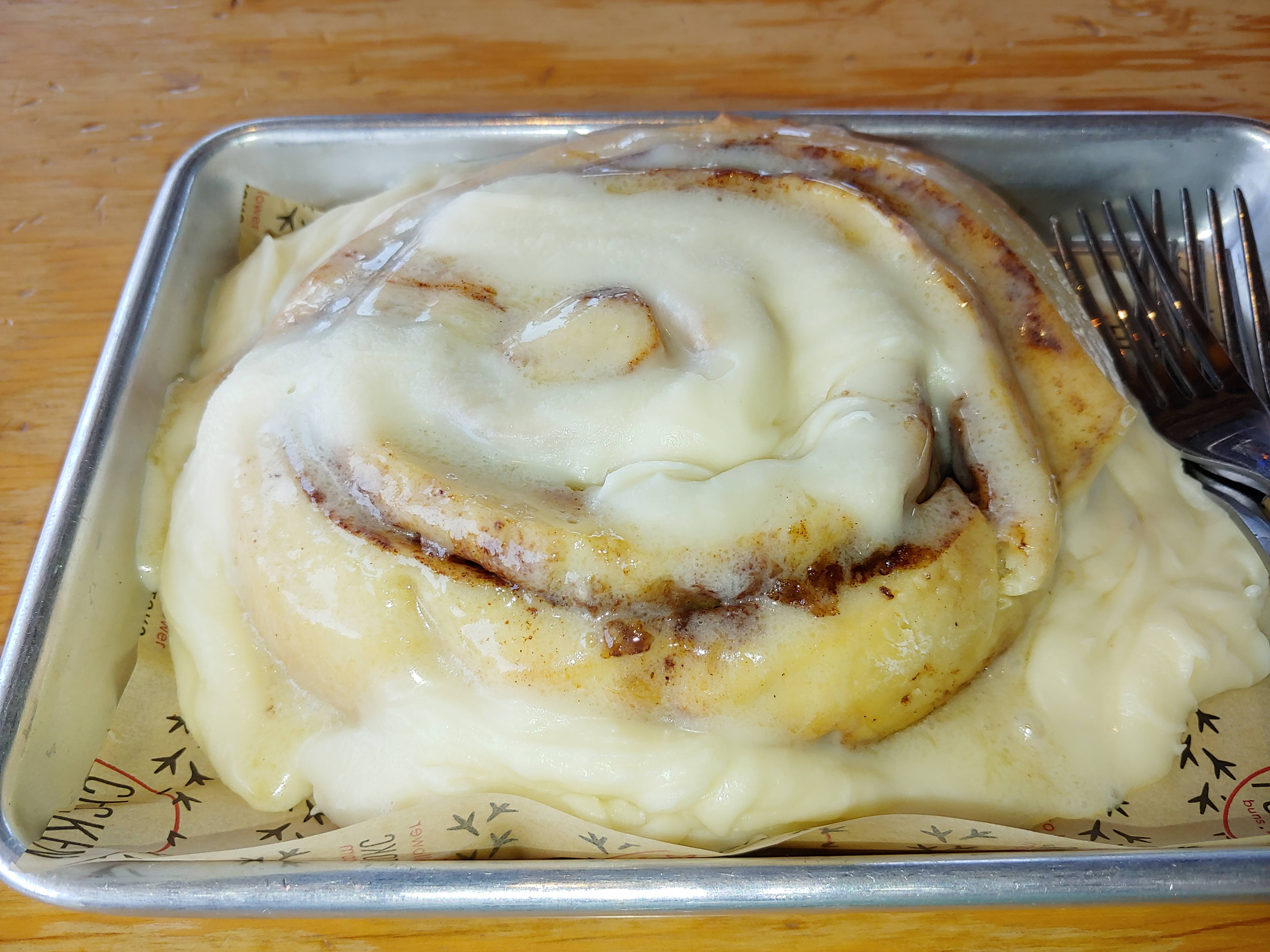 As good as their chicken sandwiches are, I enjoy two of their menu items more- the Okie poutine and the hot cinny bun. First I’ll start with the poutine, this is an Okie version complete with cream gravy. I’m not a fan of brown gravy ( I have a rant about brown vs cream gravy but I’ll share that some other time ), so I’ve never tried the original Canadian version of a poutine. This version is really good, the fries are crisp as are the bacon pieces. The cream gravy mixes well with the cheddar cheese on top. It comes in a huge tray with enough for the whole table. I have also tried the honey butter my biscuits, they were good as well. Light and buttery, good to share with the table as well.