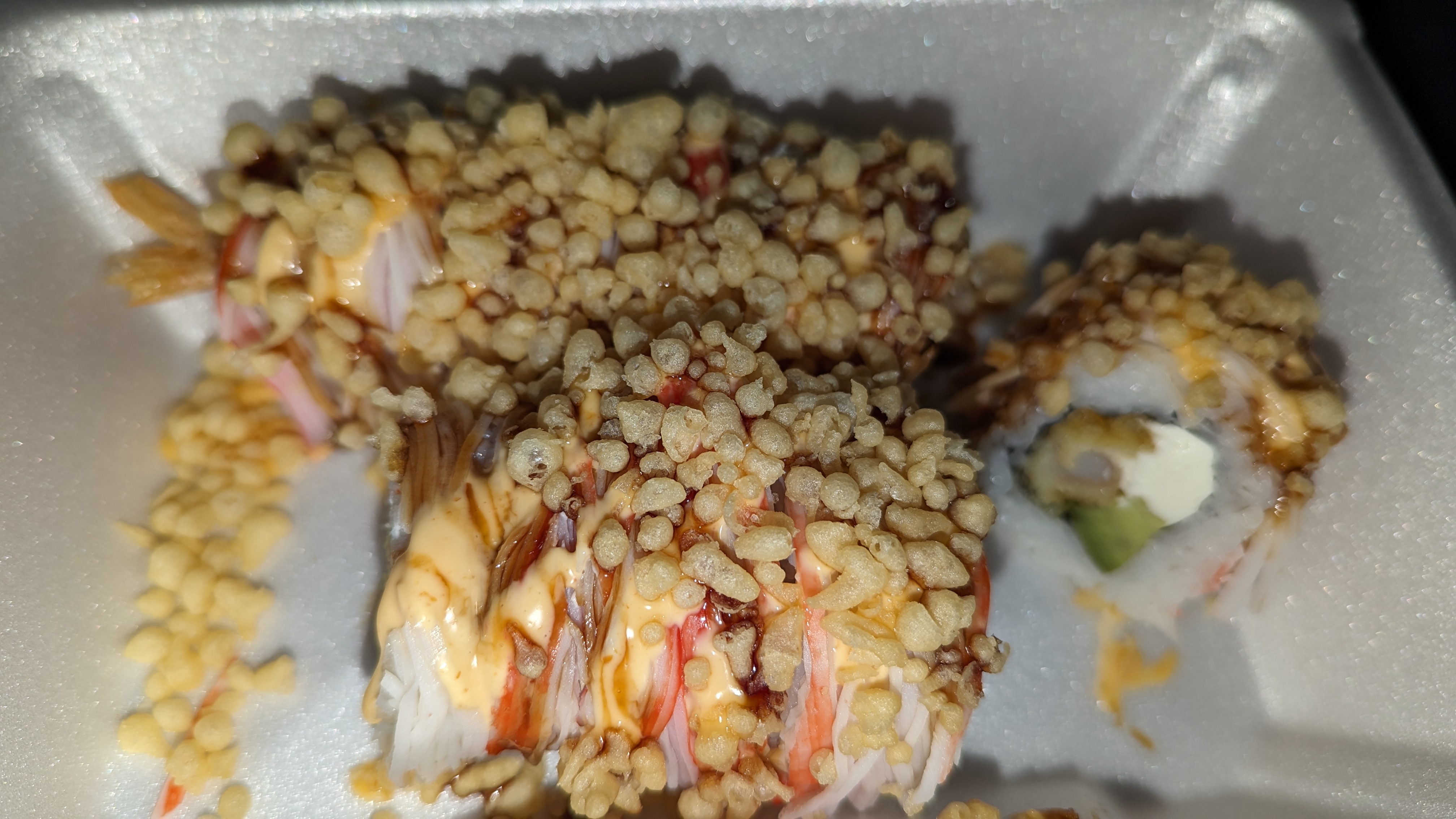 It was a quiet Friday afternoon when I stopped by to try a few items off their menu. I decided on a shrimp spring roll and a spicy cowboy roll. I was getting them to go and got them fairly quickly. The shrimp spring roll was good, huge and stuffed with shrimp and other veggies. I loved the sweet chili sauce that came with it for dipping. I moved onto the spicy cowboy roll. First of all, it was huge. Probably the biggest roll I’ve ever had. Big fat shrimp stuffed inside along with lots of cream cheese and avocado. The crap stick on top was covered in both spicy and eel sauce with lots of tempura flakes. It was so good.
