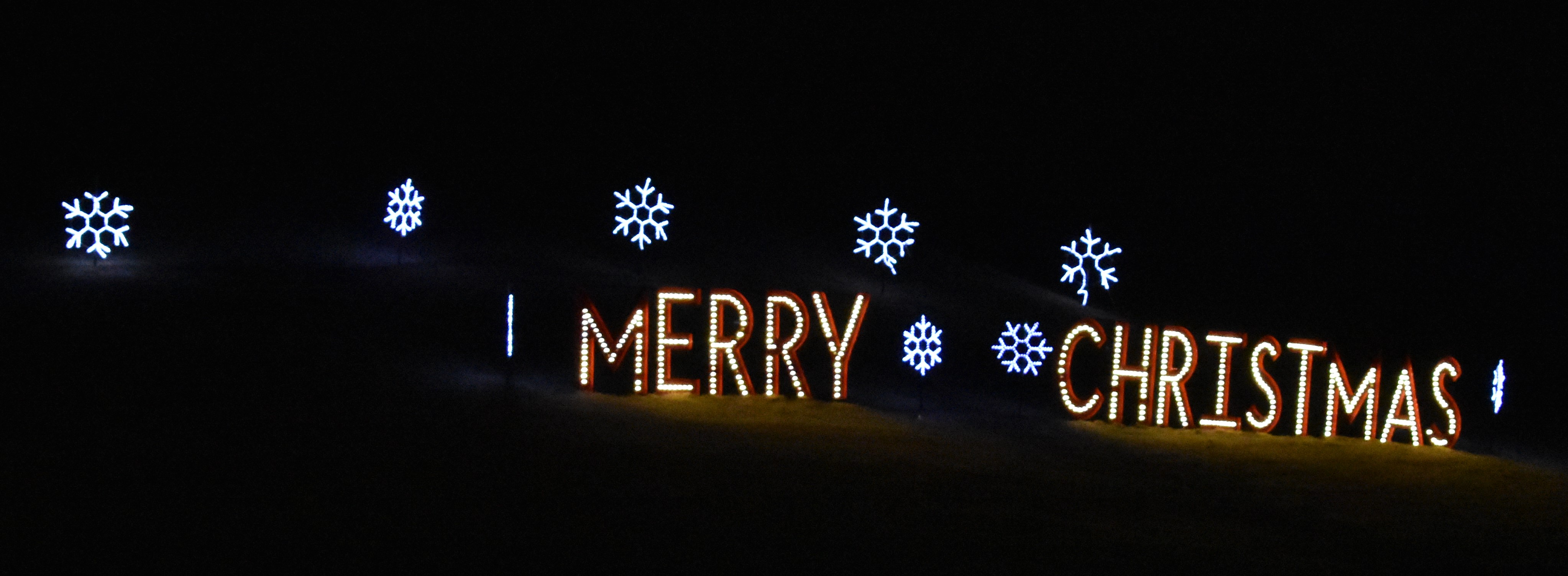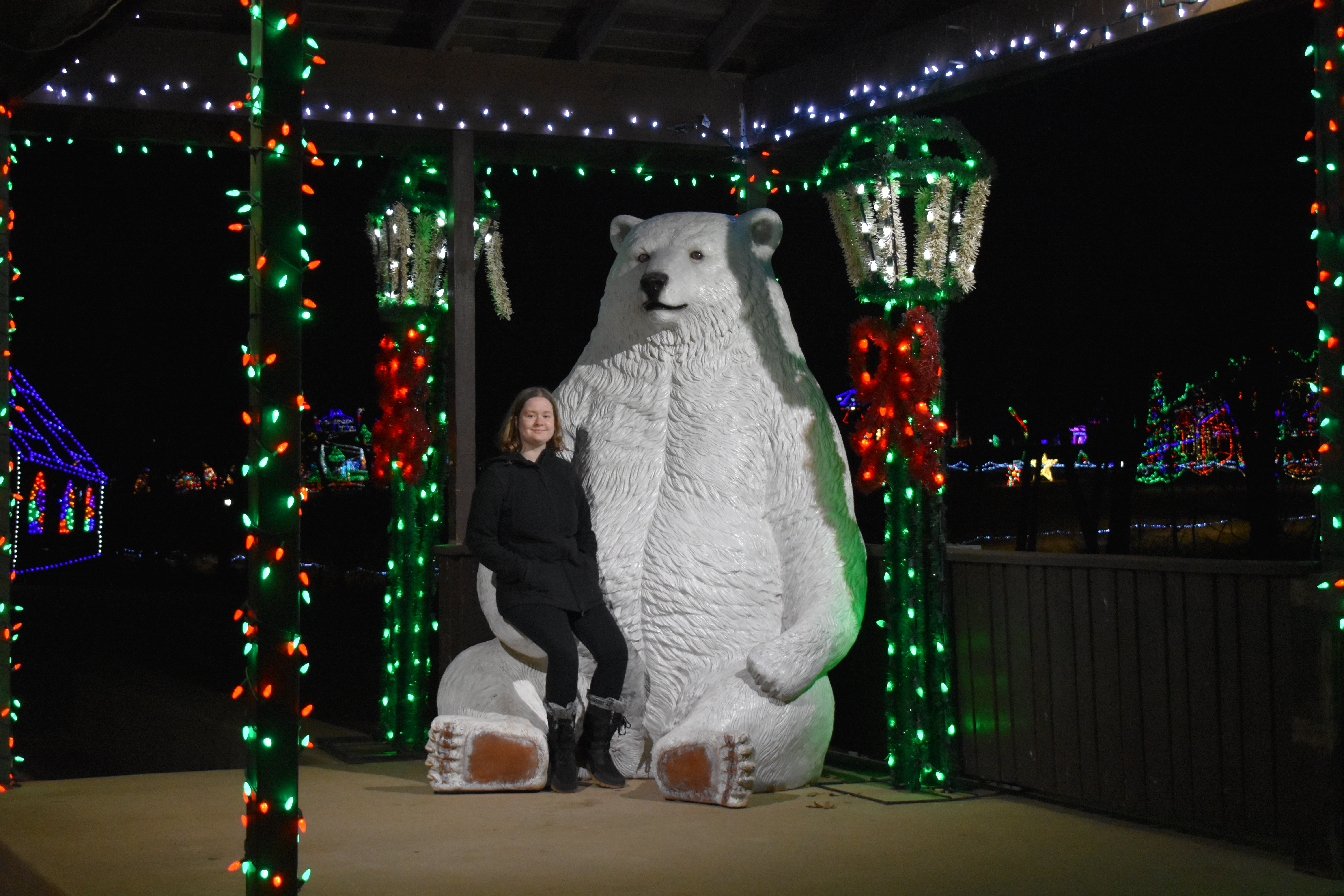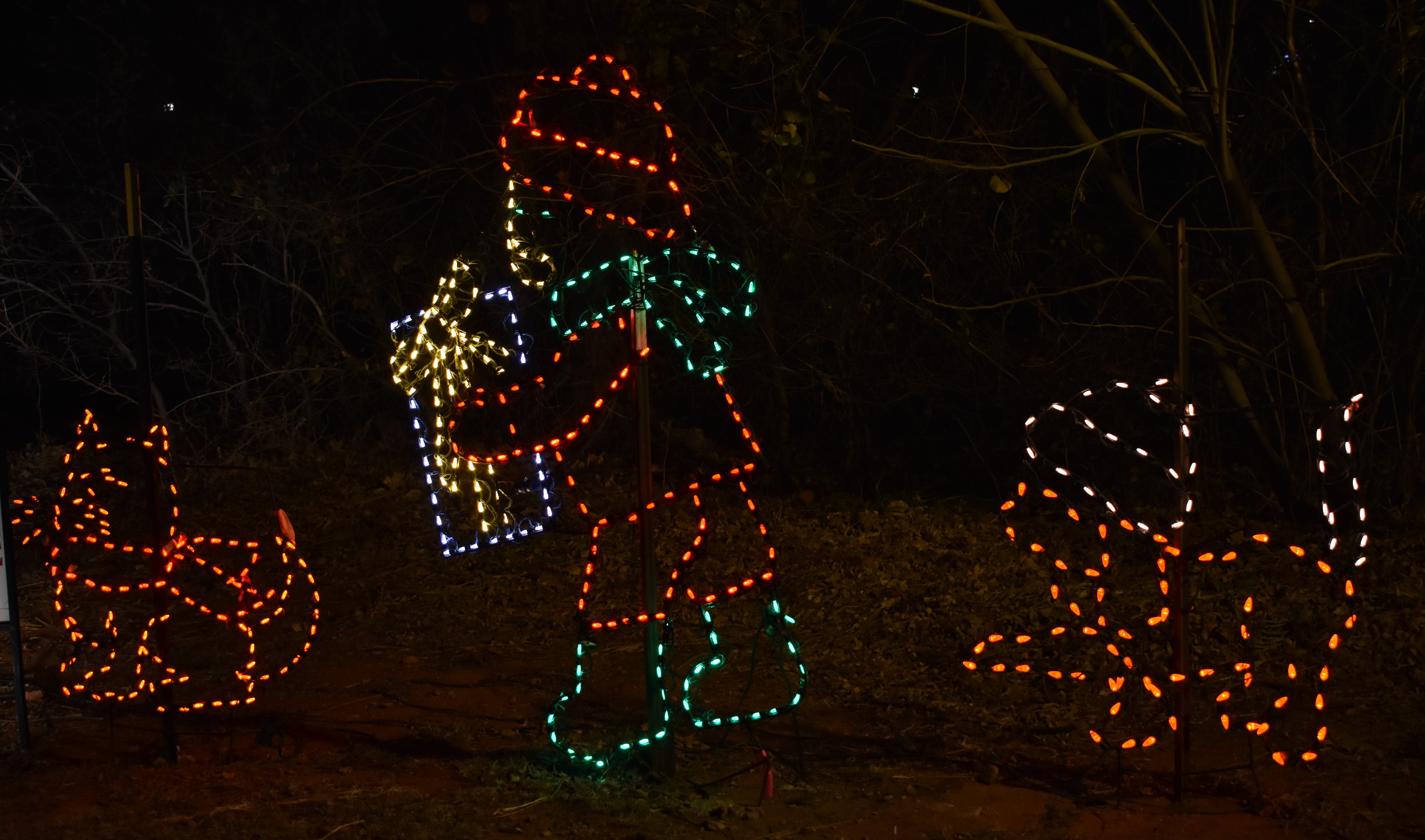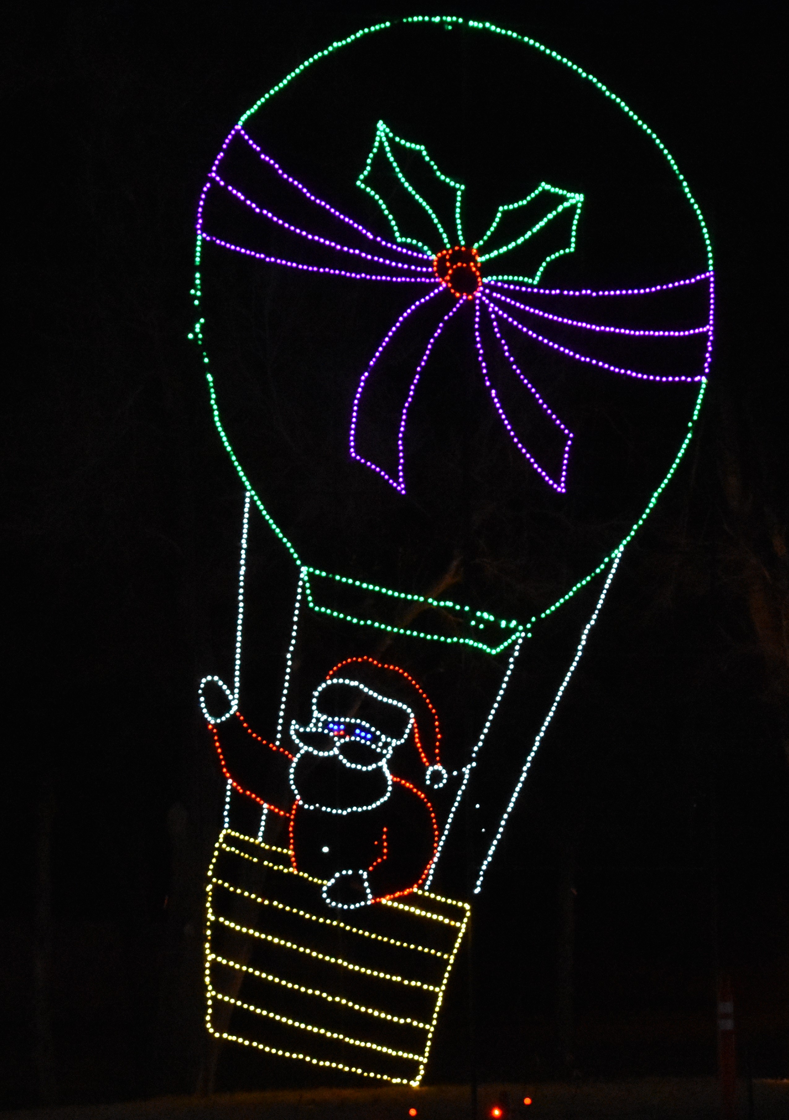 The last park is a longer drive north on Holly Avenue (right again), then back east on Vandament Avenue. Traffic is always backed up here as well, but you will only go a bit before you can turn (right once more) and be in the last park, Chisholm Trail Park. This is where you’ll find the ice-skating rink and the park train. This is where the biggest parking lot is but be careful, it’s dark and lots of people running around. While I haven’t tried ice skating, and with my knees probably won’t, it looks fun. My favorite part is the ride on the park train. It’s always done up in lights, grab one of their blankets they have to borrow, and take a ride through Chisholm Trail Park on it. Takes about 20 minutes but always worth it. Another of my favorite things to do is hike to the top of the hill just south of the parking lot. Not for the weak of heart but it is really worth the view. You can see all 3 parks, lights twinkling off the water, the train traveling through, perfect for photos. You can also walk the trails in the park and find more opportunities for selfies or pictures of family (if you don’t want to be in the pic). The new Santa bus is always fun for group photos.