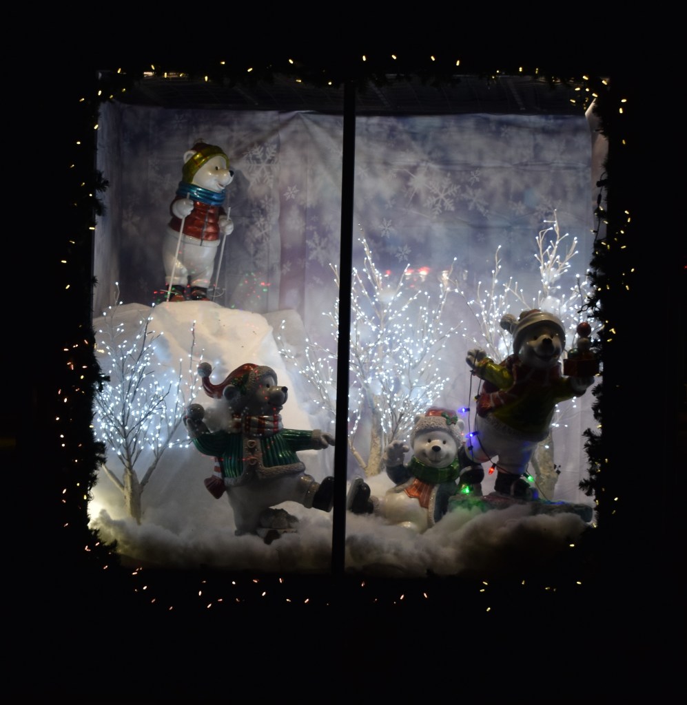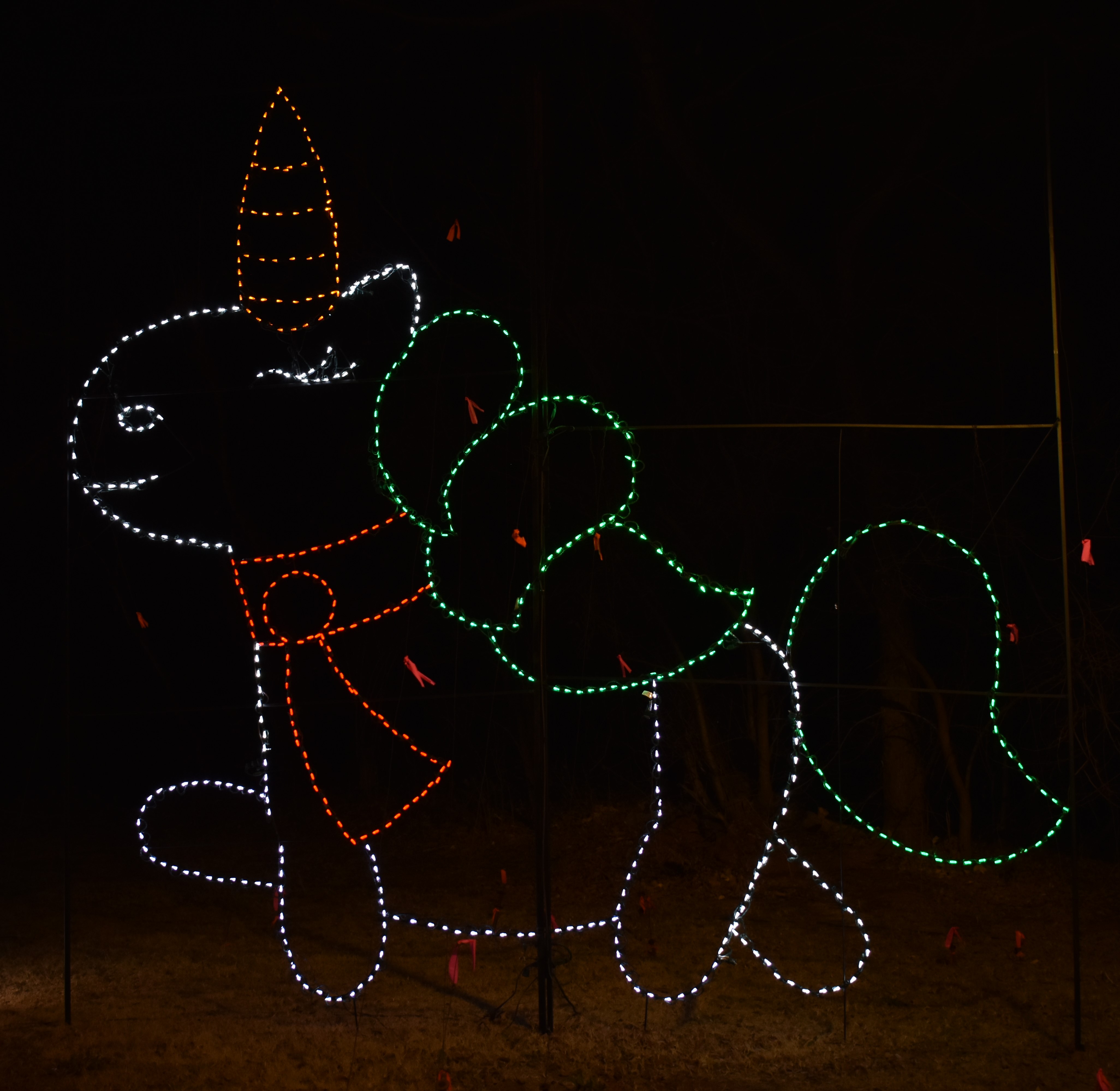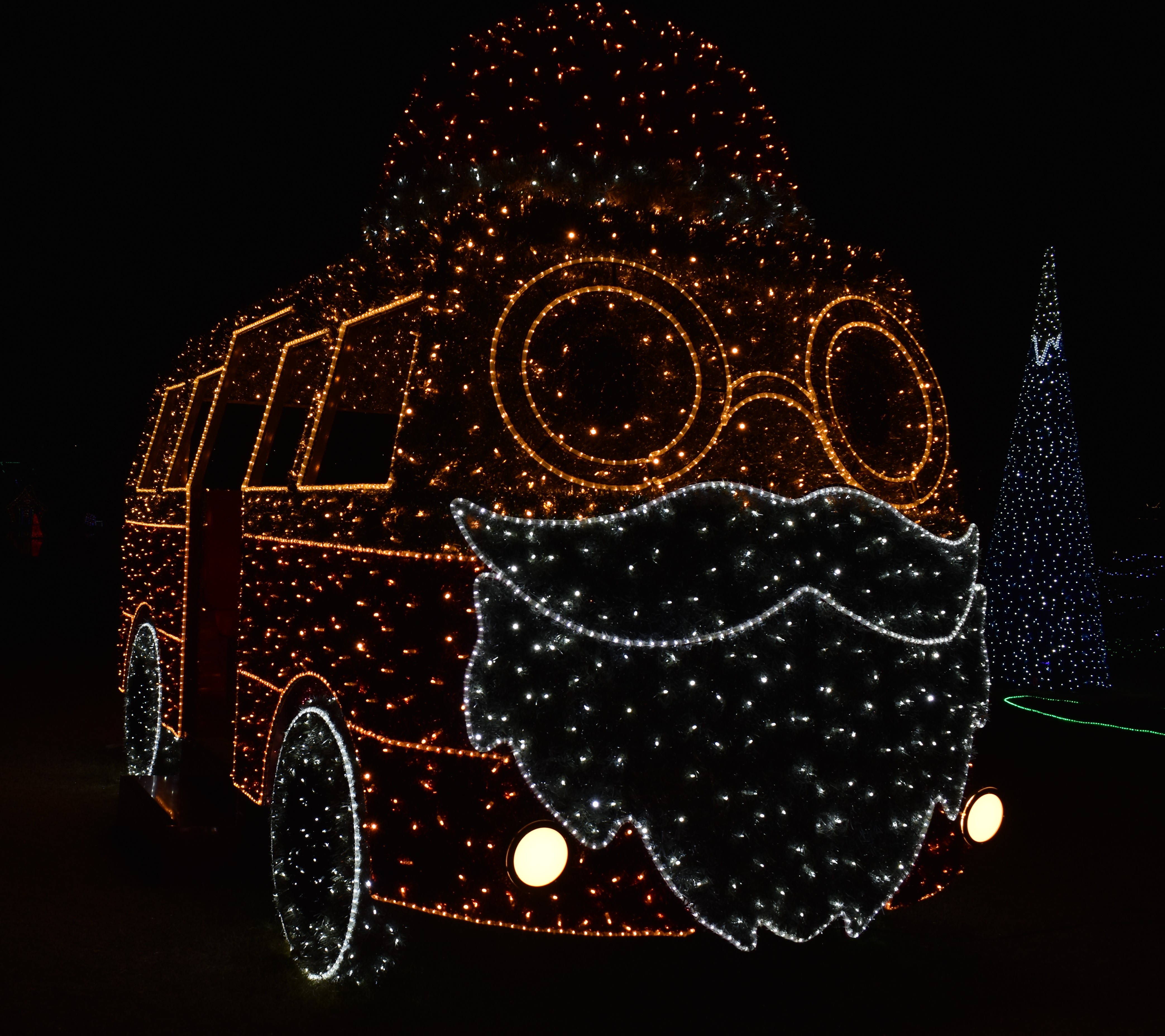 If you don’t want to do any of these things, just keep driving and you get to the last part of this Christmas journey. Past the parking lot, you are on another small tree lined road. There are displays next to the road plus you can see everything further into the park (where the train runs). The very last parking lot is where you can stop and watch the tree with dancing lights. There is a radio station you can turn on and listen to the Christmas music. The park is free to drive through but they take donations, usually the costumed characters are in the last lot taking donations.
