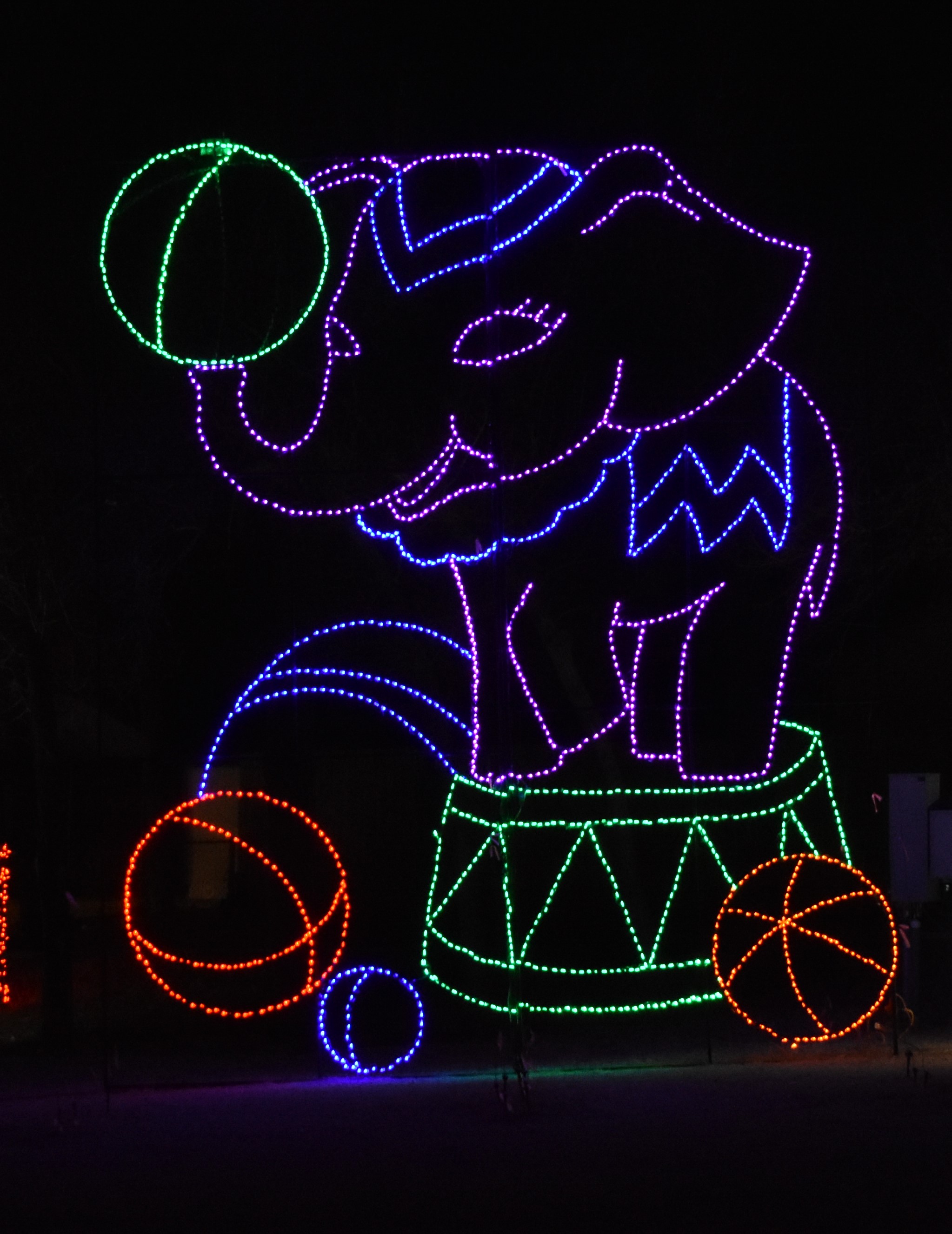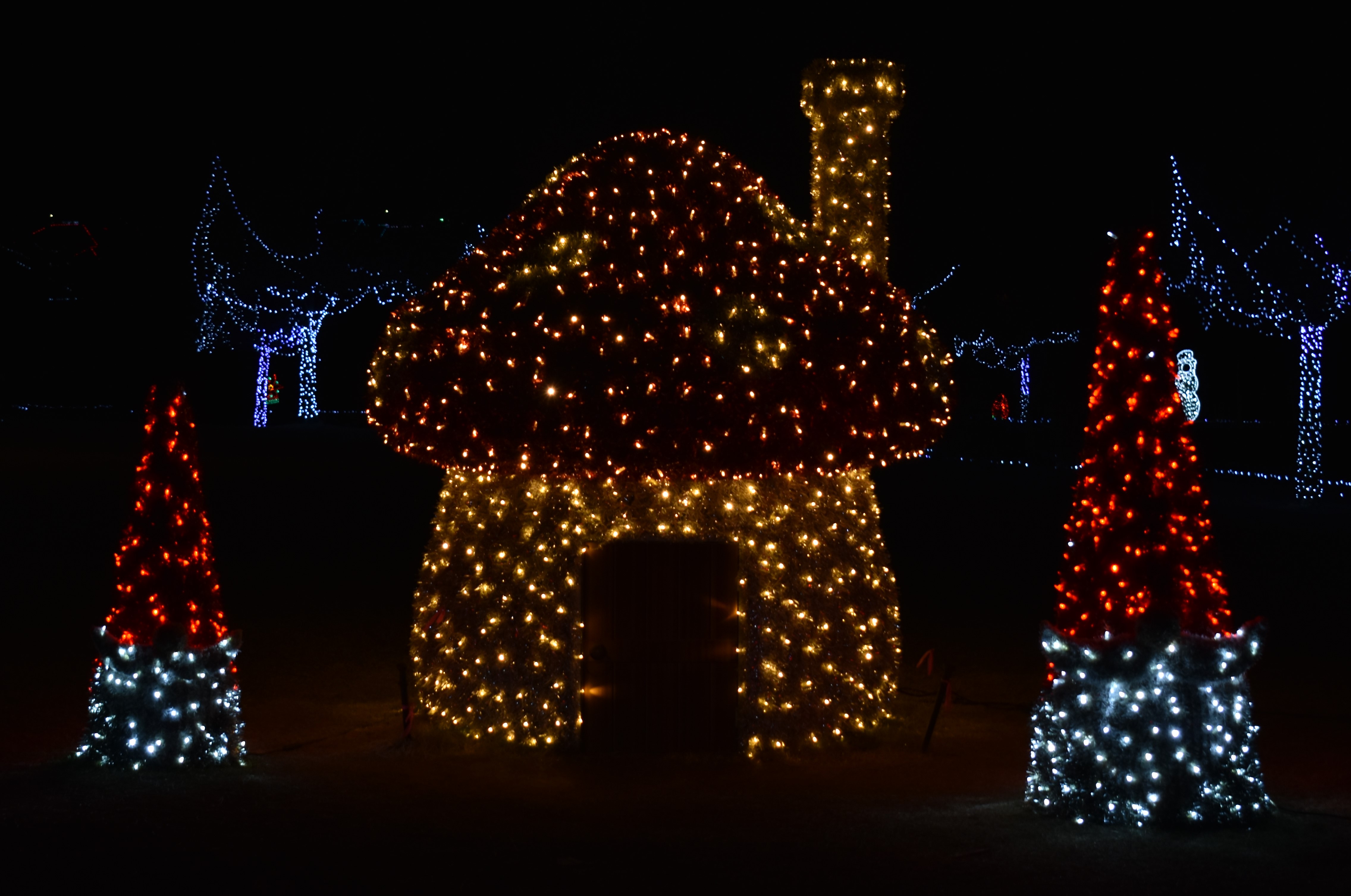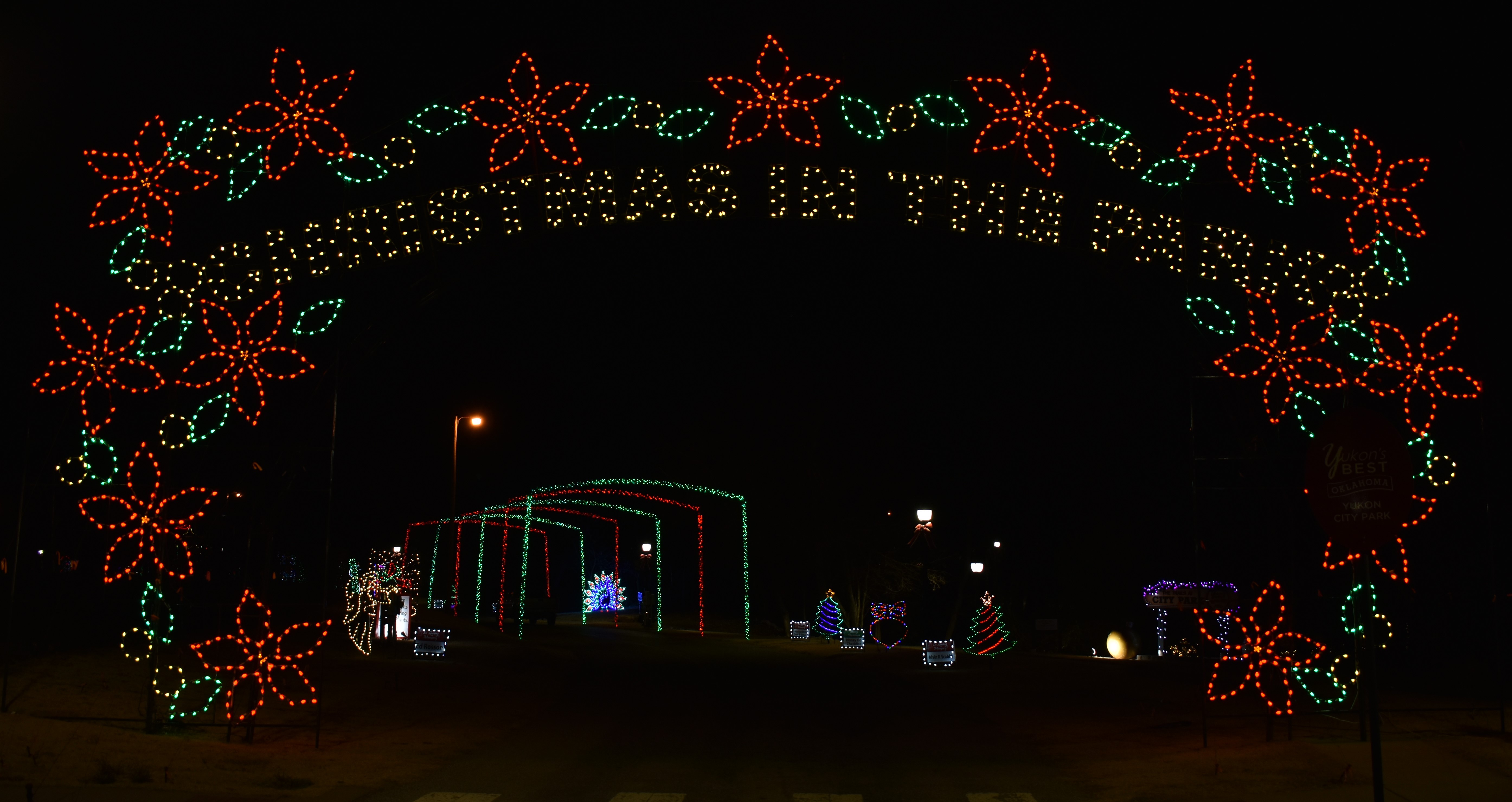 My absolute favorite Christmas light display in Oklahoma is in Yukon at their city park. The three parks have over 5 million lights and 500 displays. You start the drive at NW 10th Street and Holly Avenue. There are lighted snowmen pointing the way, the traffic usually starts right here, so be prepared to wait. The first park you will go through is the Yukon City Park. It’s a nice drive down a wooded lane with displays on both sides of the road. As you get near the pond, there will be places to park. You can get out and walk around or keep driving. As you get back to Holly Avenue, you will turn to the west (right) and head to the next park.