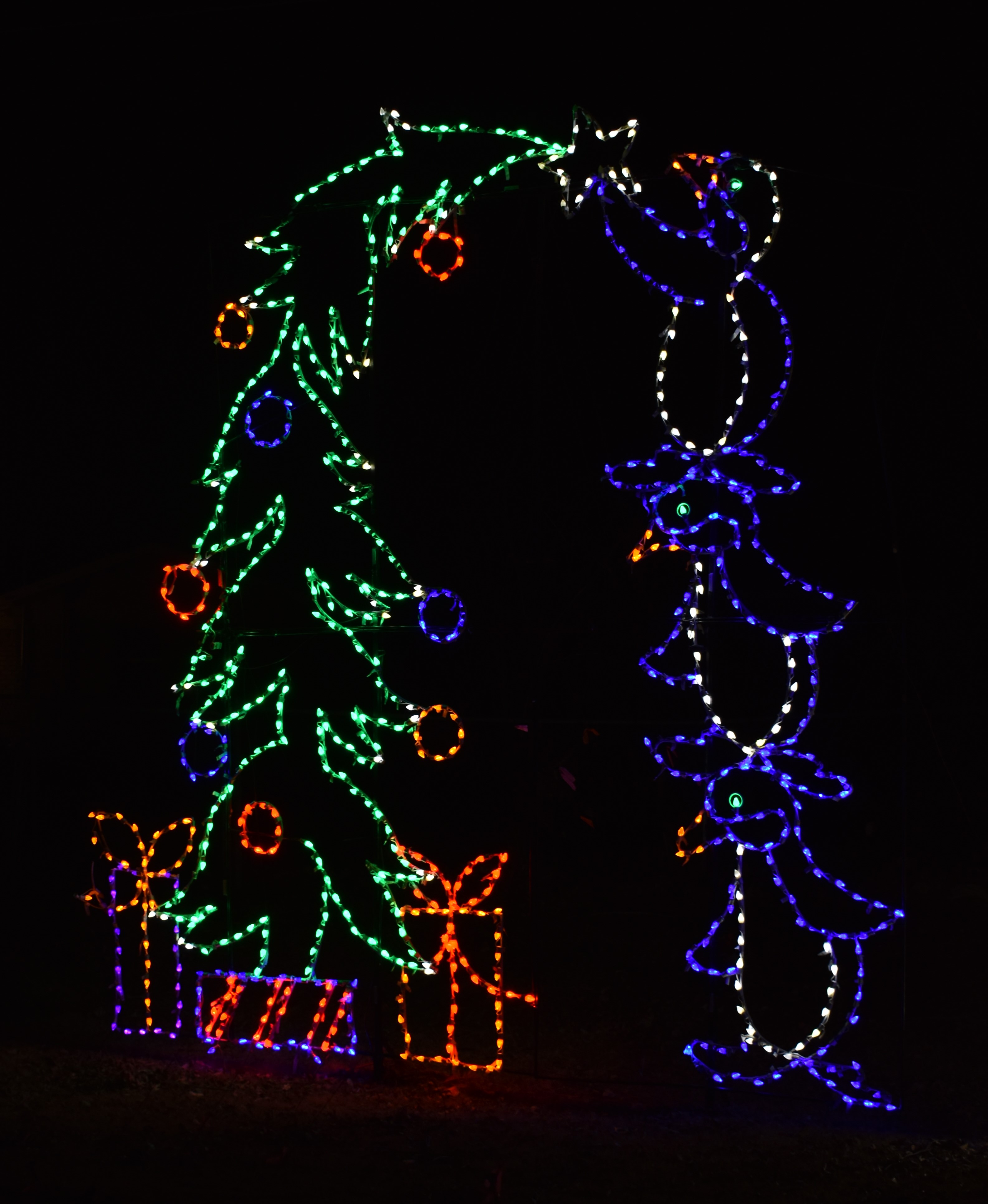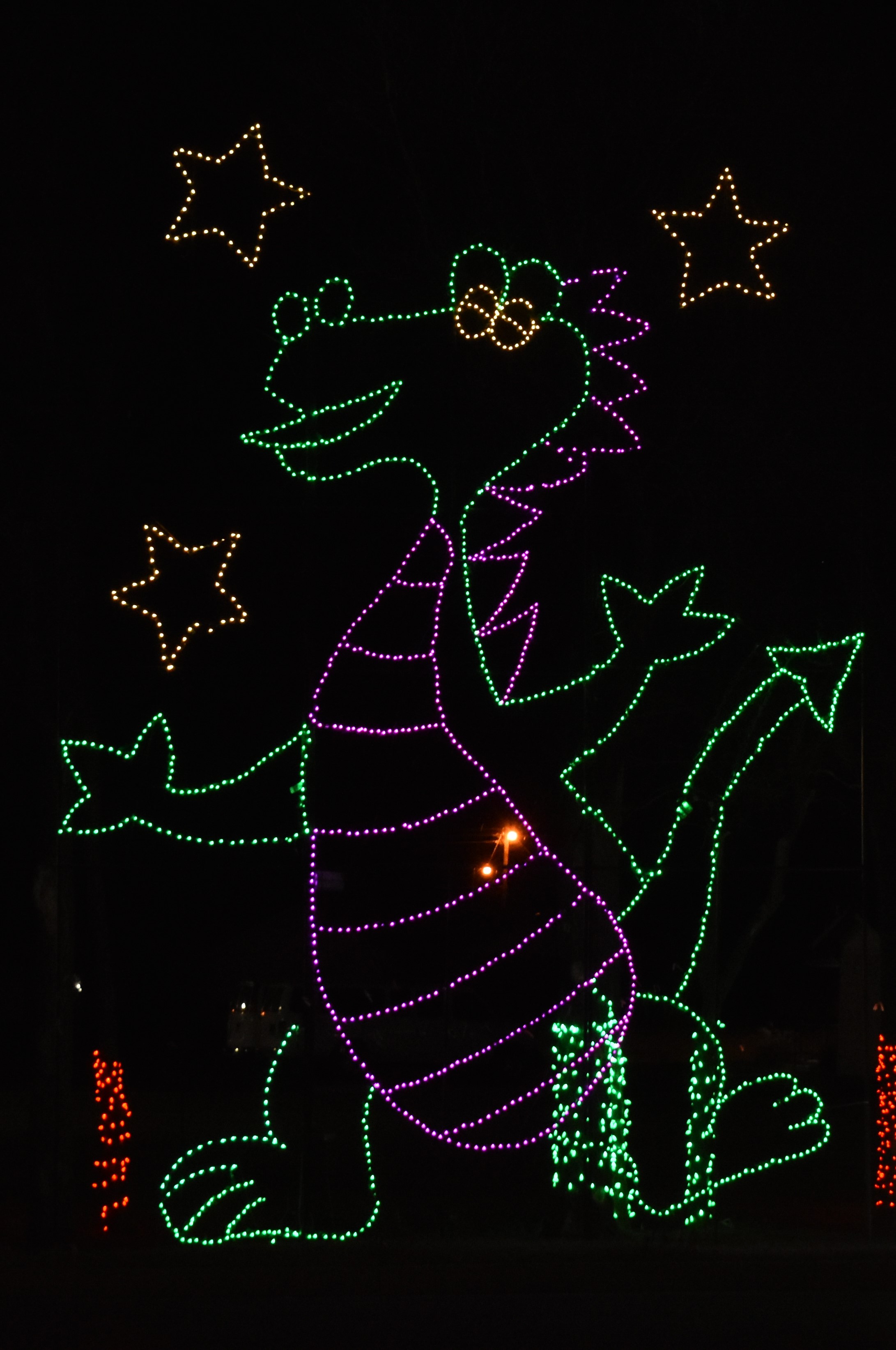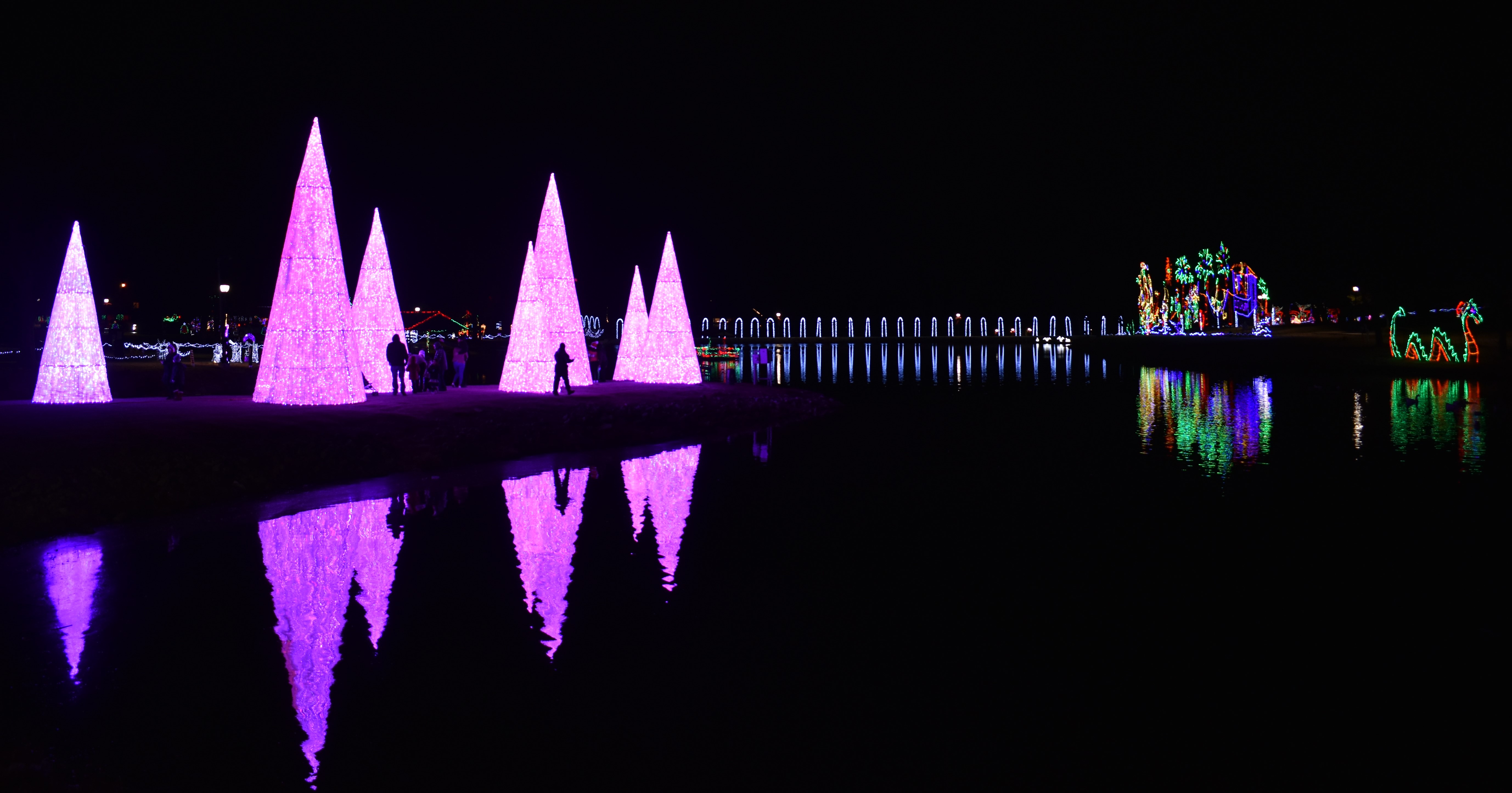 Not much driving to Freedom Trail Park. If you don’t know it’s there you’ll miss it but this small park has a bigger parking area. You can walk to the other 2 parks or just drive through. It’s really just circling around the parking lot but there are displays set up. If you get out to walk, there are plenty of selfie stations to take pictures. Mulvey Pond is right there with bridges lit up as well as great views of the large displays across the water. Really is beautiful the way light reflects off the water.